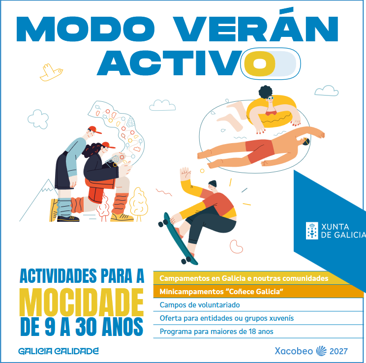 Baixo o lema “Modo verán activo” a Xunta de Galicia, a través da Campaña de Verán, oferta a posibilidadade de que empregues o teu tempo libre estival participando en actividades de educación non formal de carácter lúdico, cultural, deportivo, formativo, etc